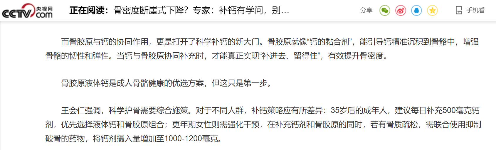 因此,央视报道中专家建议,40岁以上人群如希望真正维护骨骼健康,在补钙的同时,应特别重视骨胶原的补充。