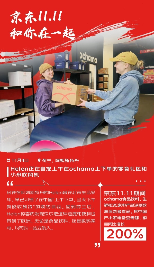 这个京东11.11,ochama也给欧洲消费者带来了“又便宜又好”的购物体验,食品饮料、生鲜和3C家电产品深受欧洲消费者喜爱,其中,国产小家电备受青睐,销量同比增长200%。作为京东旗下的欧洲全渠道零售品牌,ochama已在欧洲24个国家提供送货上门服务,在Helen所在的地区,ochama还提供小时达、当日达、当日自提等多种履约模式。
